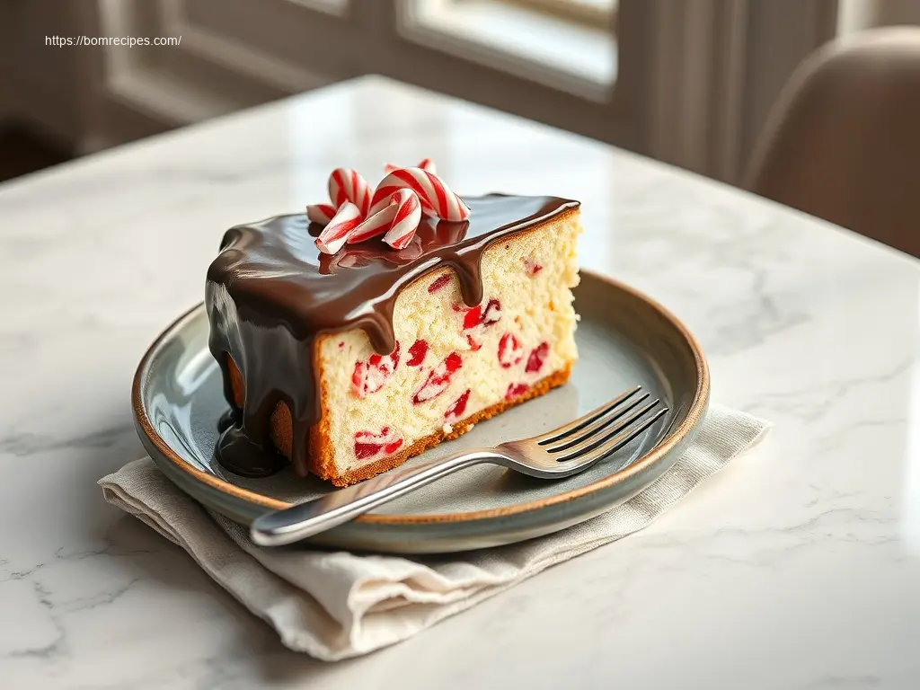 A rich and festive cheesecake featuring an Oreo crust, a creamy peppermint-infused filling with crushed candy canes, and topped with a luscious chocolate ganache, perfect for holiday celebrations.