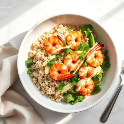 This Shrimp Quinoa Bowl with Lemon Tahini is a great choice. It has bright, fresh flavors. The meal is packed with protein, healthy fats, and vitamins. It is quick and easy to prepare, perfect for busy weeknights. This dish is also gluten-free and dairy-free. You can change it to fit your taste.
